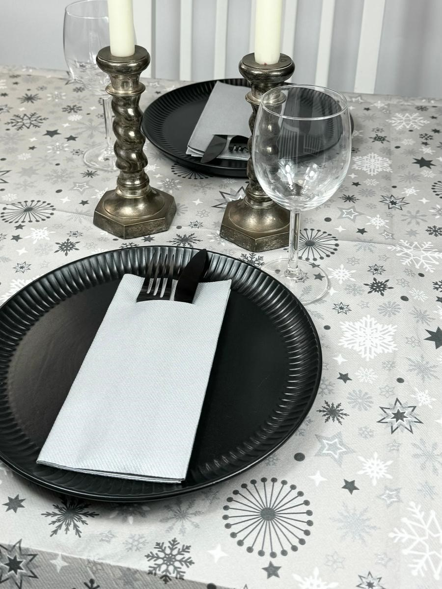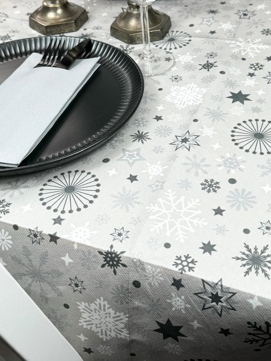 Față asztali Linclass Snowflakes cu imprimeu de iarnă în tonuri de szürke și argintiu ideală pentru decorarea meselor ünnepi din sezonul rece.