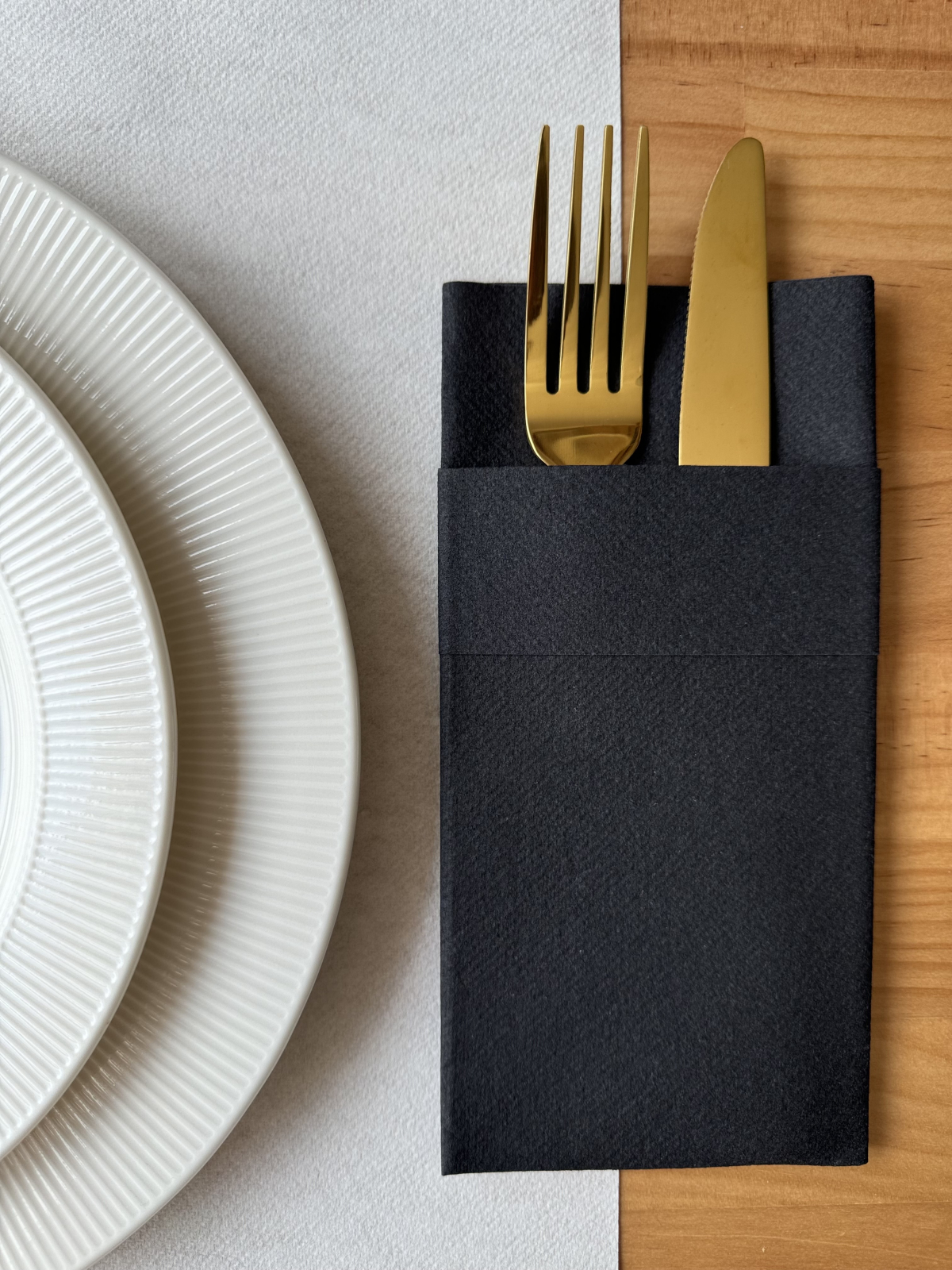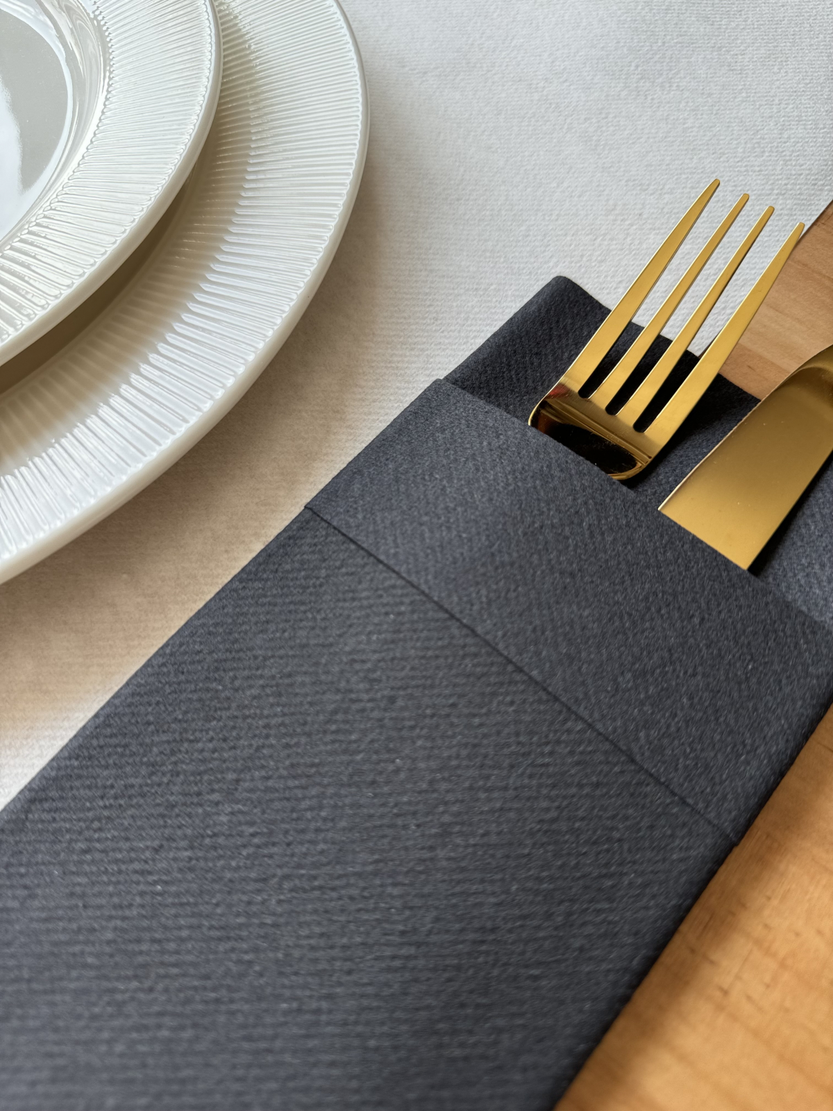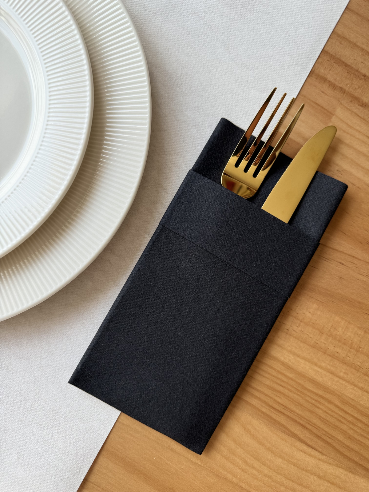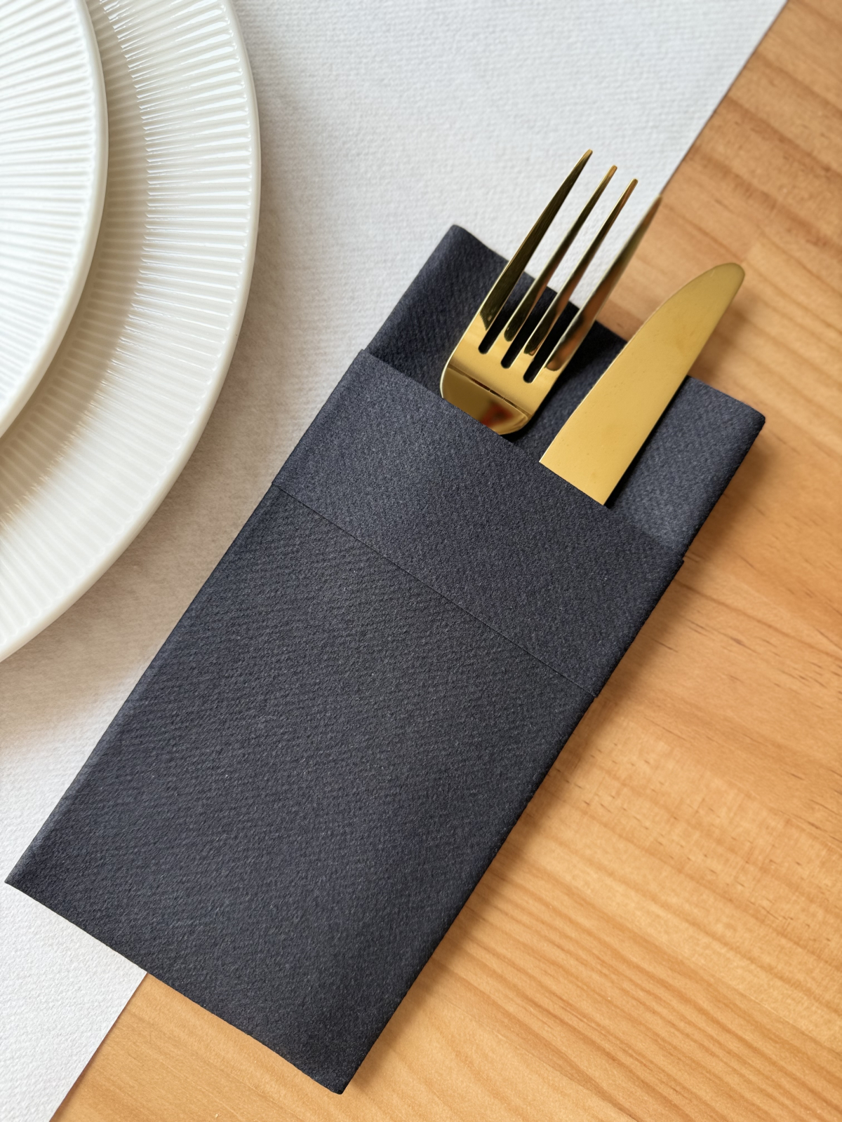 A zsebes szalvéták a design és funkcionalitás tökéletes harmóniáját képviselik. Higiénikus bemutatóhelyet biztosítanak az evőeszközök számára, és elegáns megoldást kínálnak bármely HoReCa-helyszínen. - Előre hajtogatva, azonnal használatra készek - Az evőeszközöket higiénikusan és elegánsan lehet elhelyezni bennük, a speciális bemetszésnek köszönhetően - Amellett, hogy hasznosak, színt és dekorációs elemet is visznek az asztalokra - Ideális választás minden vendéglátóipari helyszínre Airlaid anyagból készülnek, kiváló minőségben, rendkívüli teljesítménnyel: • Textilszerű megjelenés • Magas nedvszívó képesség, jóval meghaladja a hagyományos papírt • Nagy kopásállóság, még nedvesen is • Prémium minőség – Made in Germany Rendeld meg most, és adj extra eleganciát asztalaidnak!