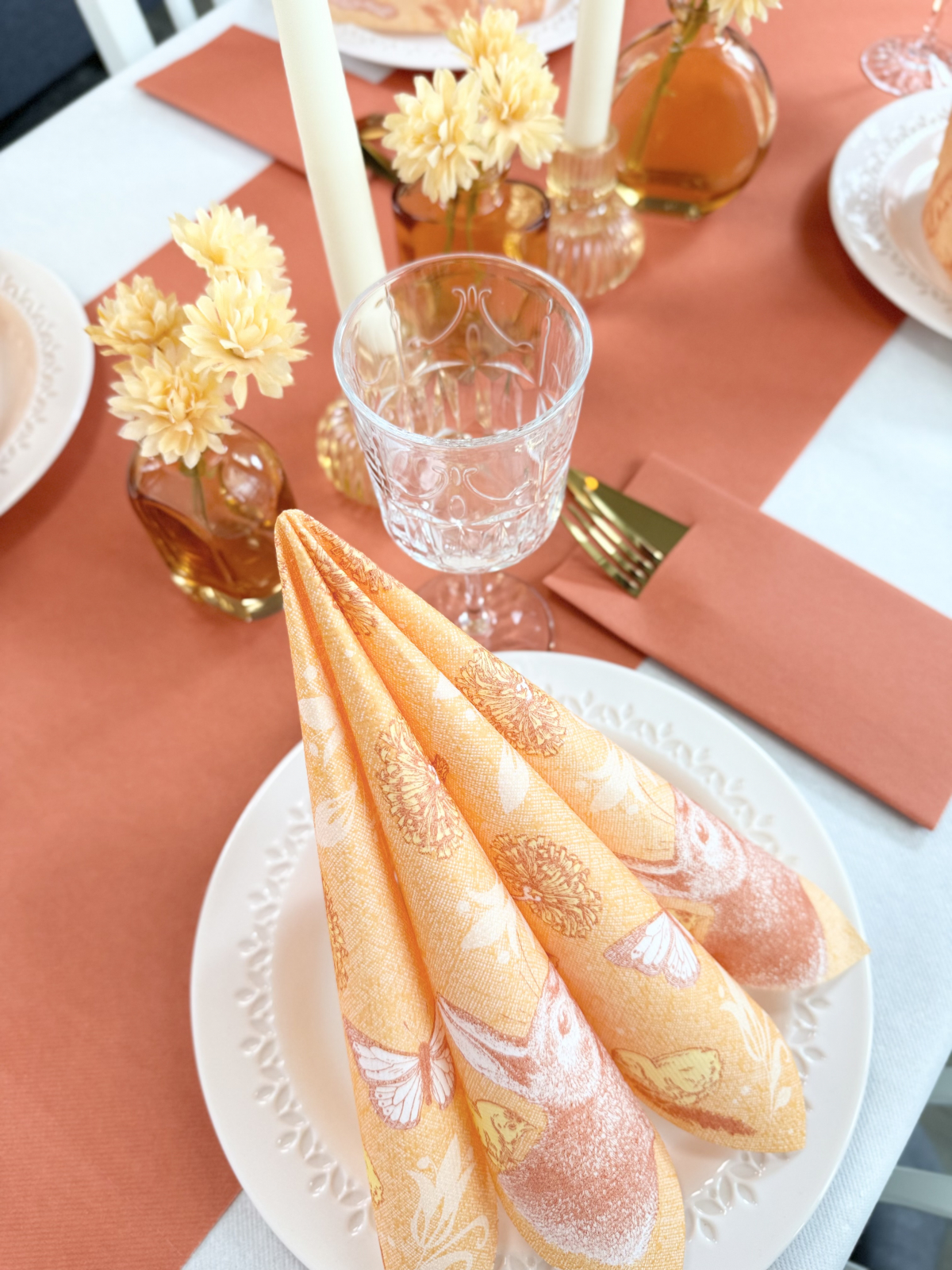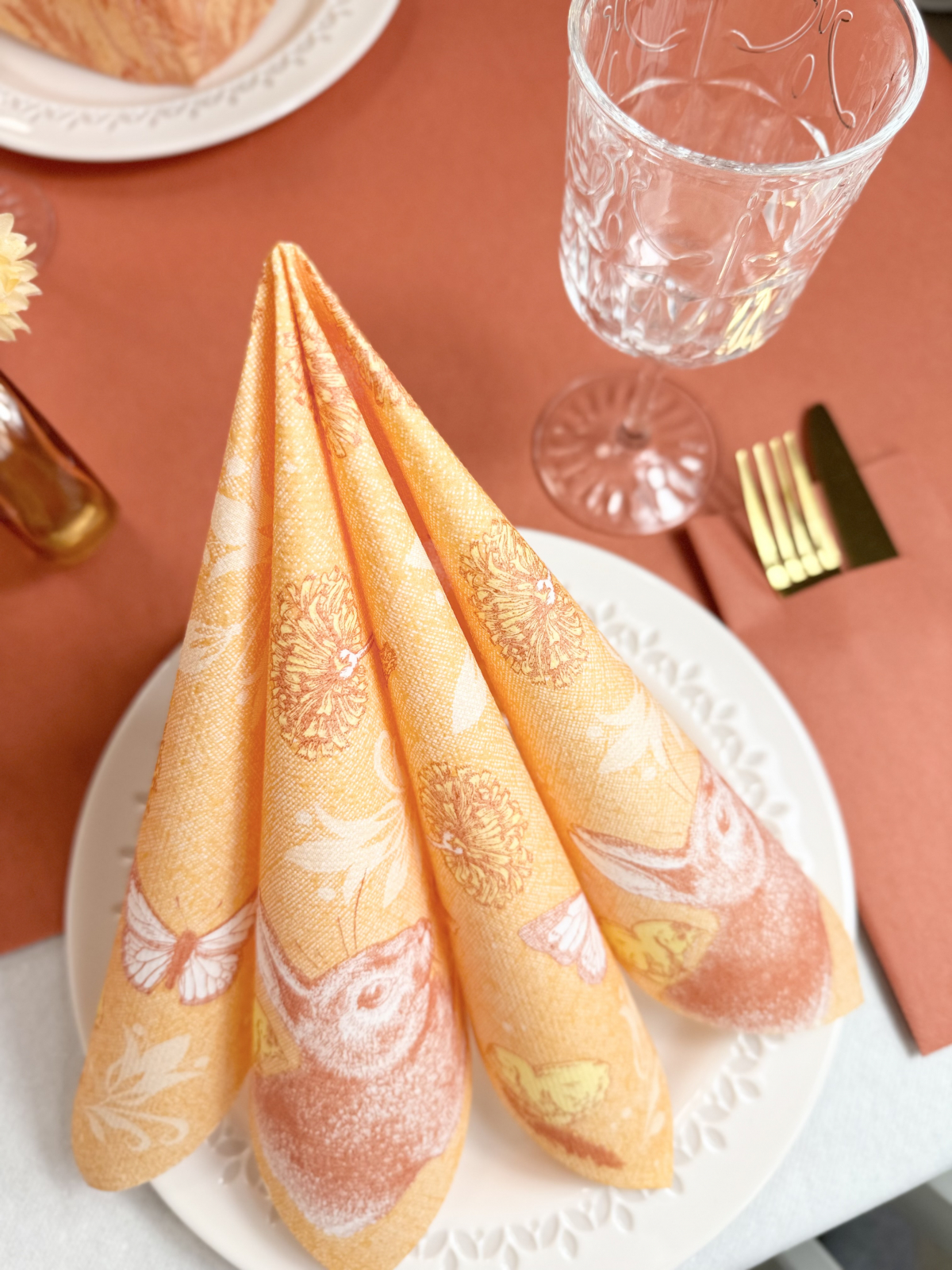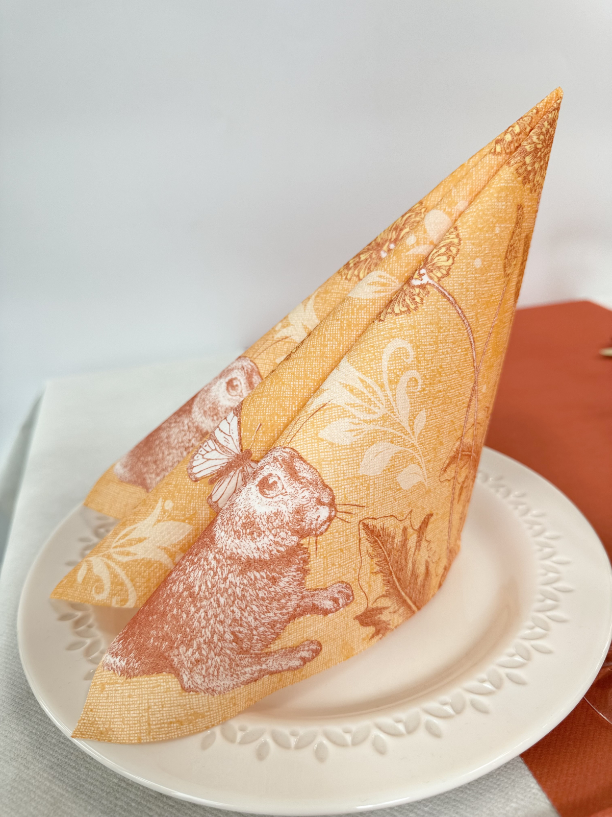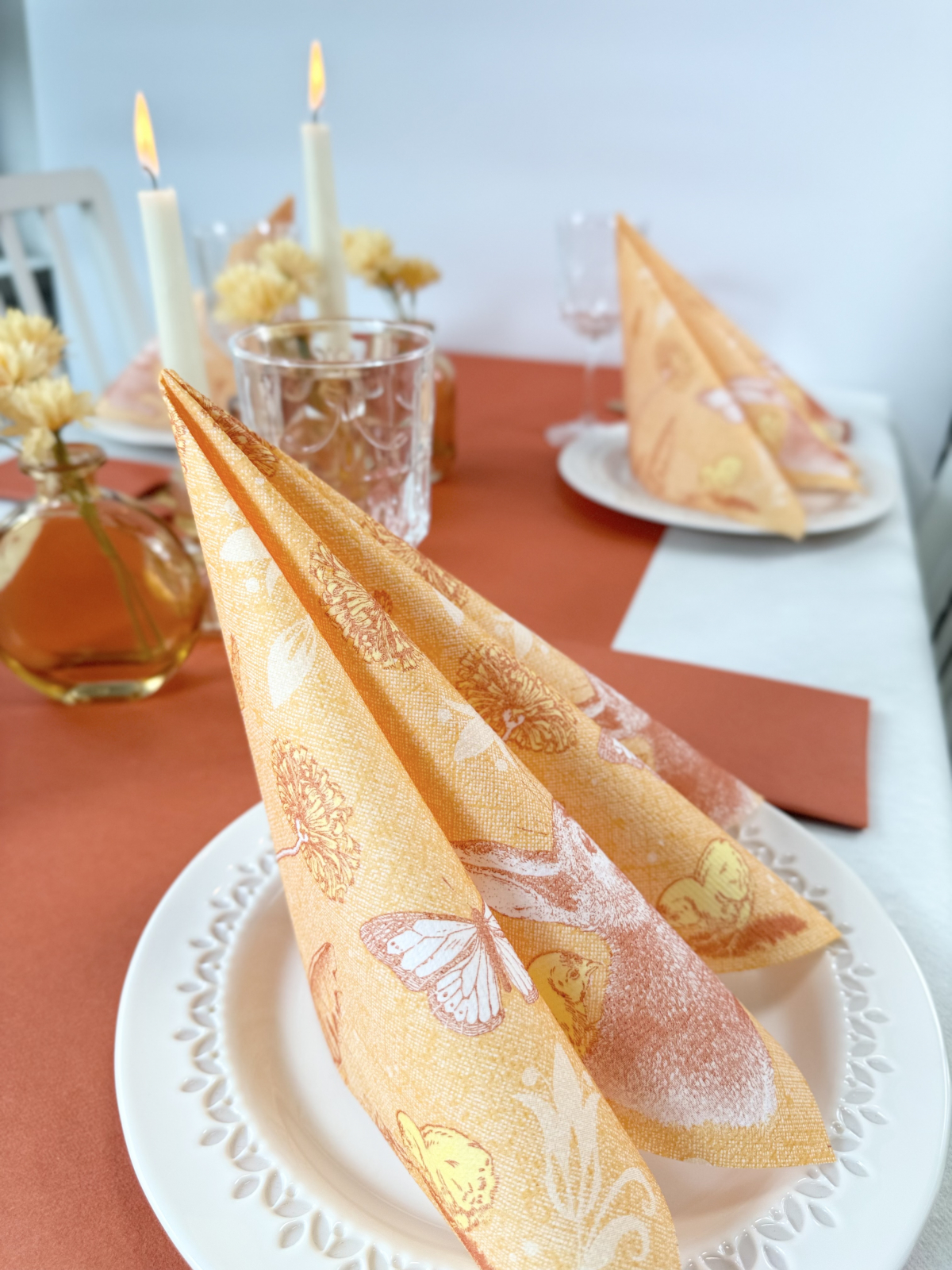 Șervețelele ünnepi Peter, cu imprimeu delicat cu iepurași și fluturi, pe fundal narancs pastel, înfrumusețează și înveselesc orice masă festivă de Paște sau mesele din cadrul evenimentelor pentru copii.